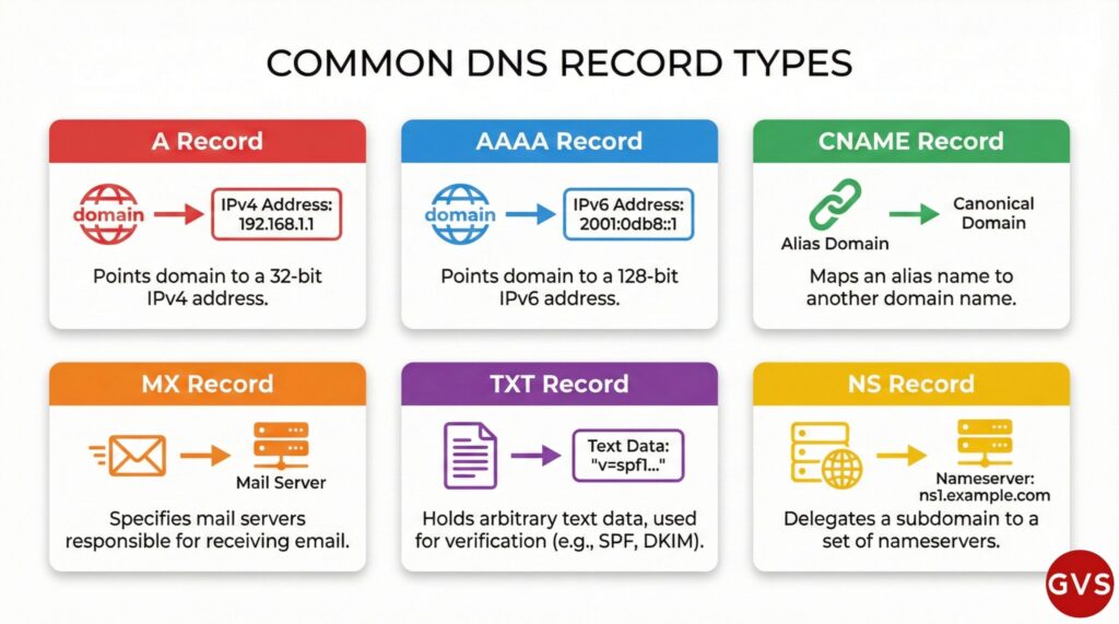 A records map a domain name to one or multiple IPv4 address(es). This is the most common and fundamental DNS record type. For example, when you type “example.com,” the A record tells your computer that example.com points to 93.184.216.34 (an IPv4 address).