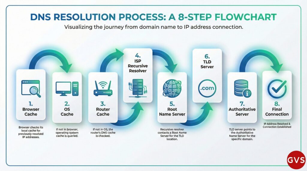 Alright, here’s where things get really fascinating. Understanding what is DNS and how does it work requires us to follow a query’s journey from your browser to the destination server and back. I promise to make this as simple as possible.