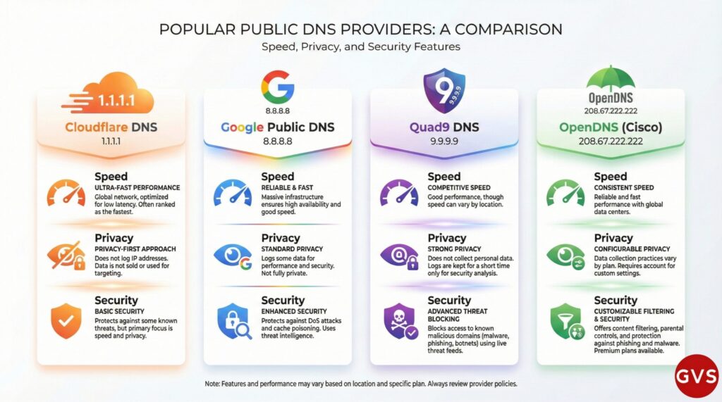 • Public DNS servers like Cloudflare (1.1.1.1) and Google (8.8.8.8) can improve speed and security