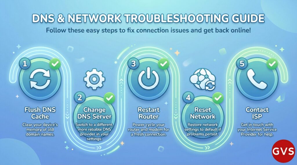 To fix DNS problems, try these steps in order: (1) Flush your DNS cache using commands like ipconfig /flushdns on Windows; (2) Change to public DNS servers like Cloudflare (1.1.1.1) or Google (8.8.8.8); (3) Restart your router by unplugging it for 30 seconds; (4) Reset your network settings; (5) Disable VPN or proxy temporarily; (6) Check for malware that might be hijacking DNS; (7) Update your network drivers; and (8) Contact your ISP if problems persist. Most DNS issues can be resolved with one of these steps.